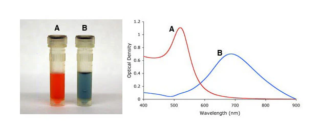 Nano particles have a surface plasmon resonance (SPR) peak in the UV-Vis spectrum, which is sensitive to their size, shape, and environment. Read my notes here.